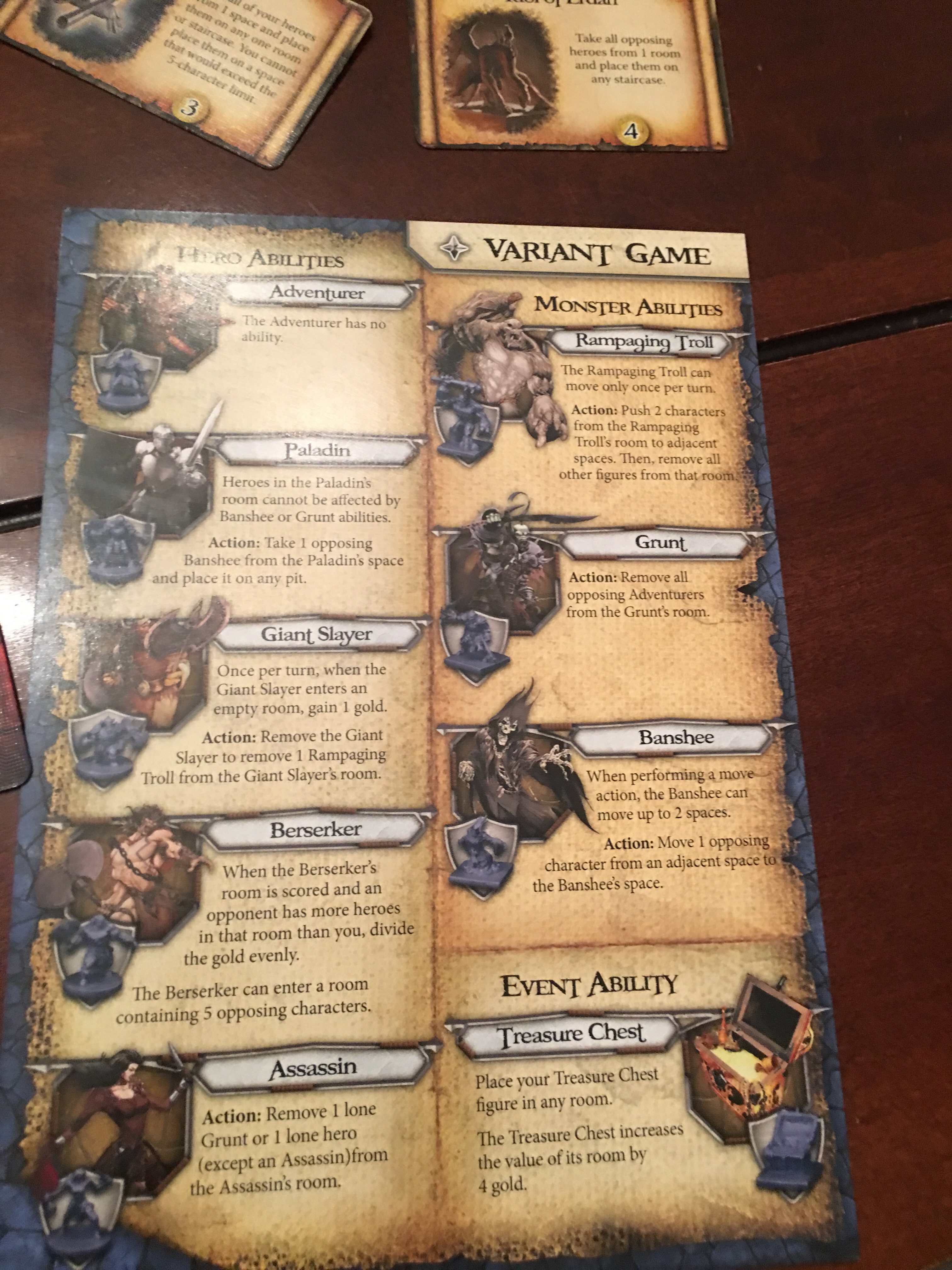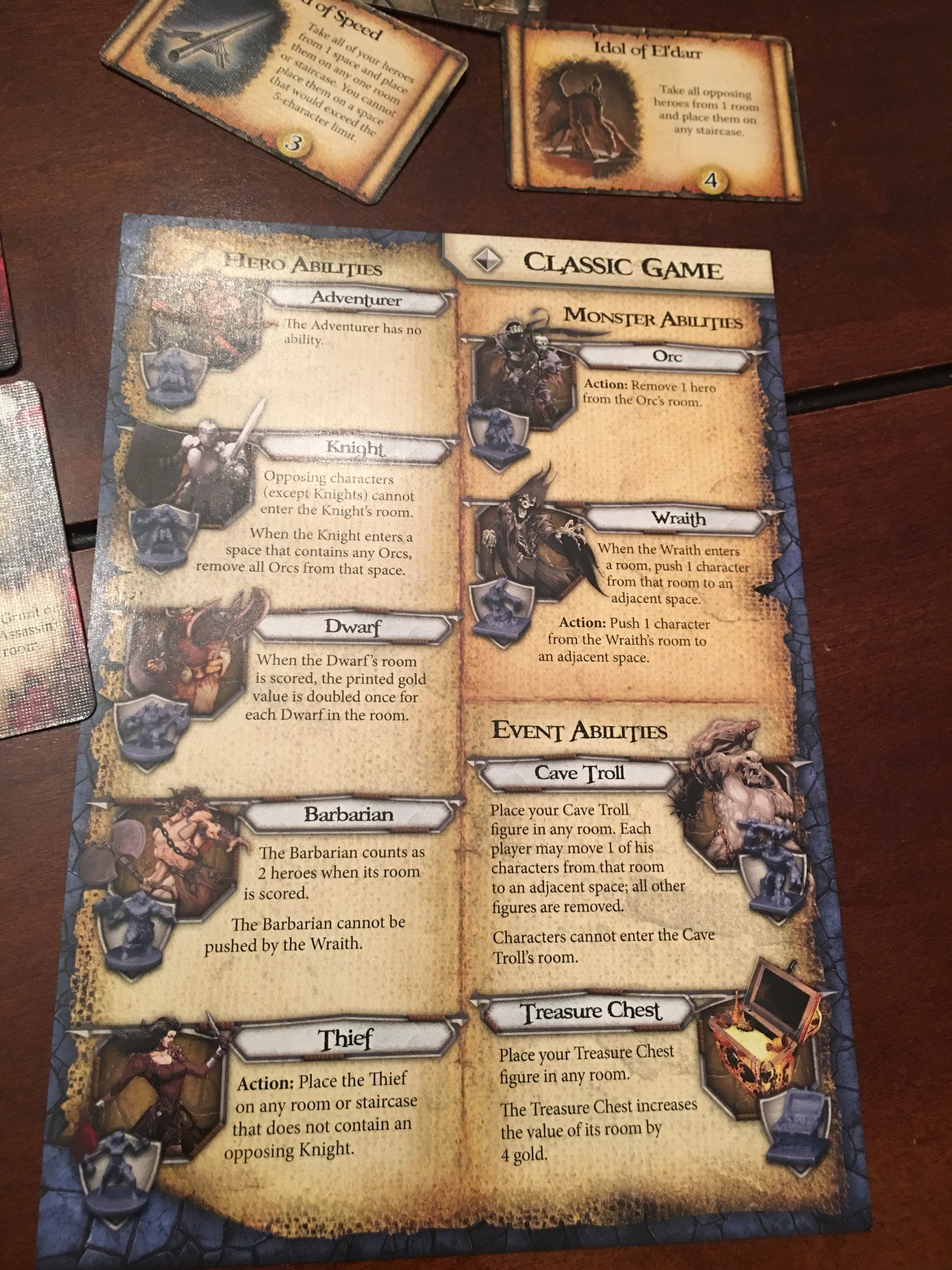 This board game is a dungeon crawl for gold allowing for 2-4 players. There is a healthy dose of strategy that accompanies the luck of the draw. The different tokens have varying abilities and there is some unpredictability to it as well. The goal is to place tokens in “rooms” of the dungeon with gold pieces. The gold pieces (printed on the board) are scored during the game based off of certain cards and at the end.