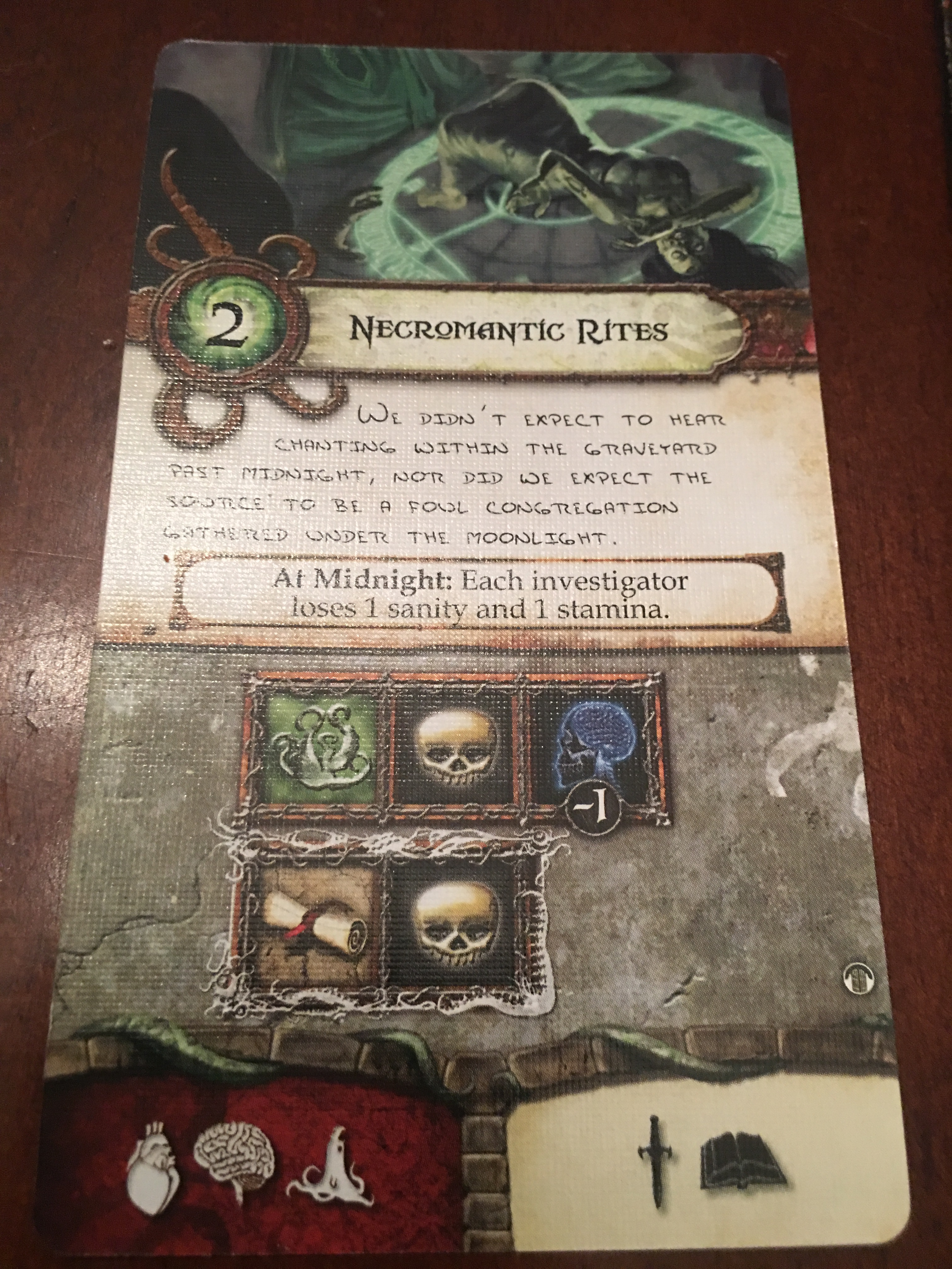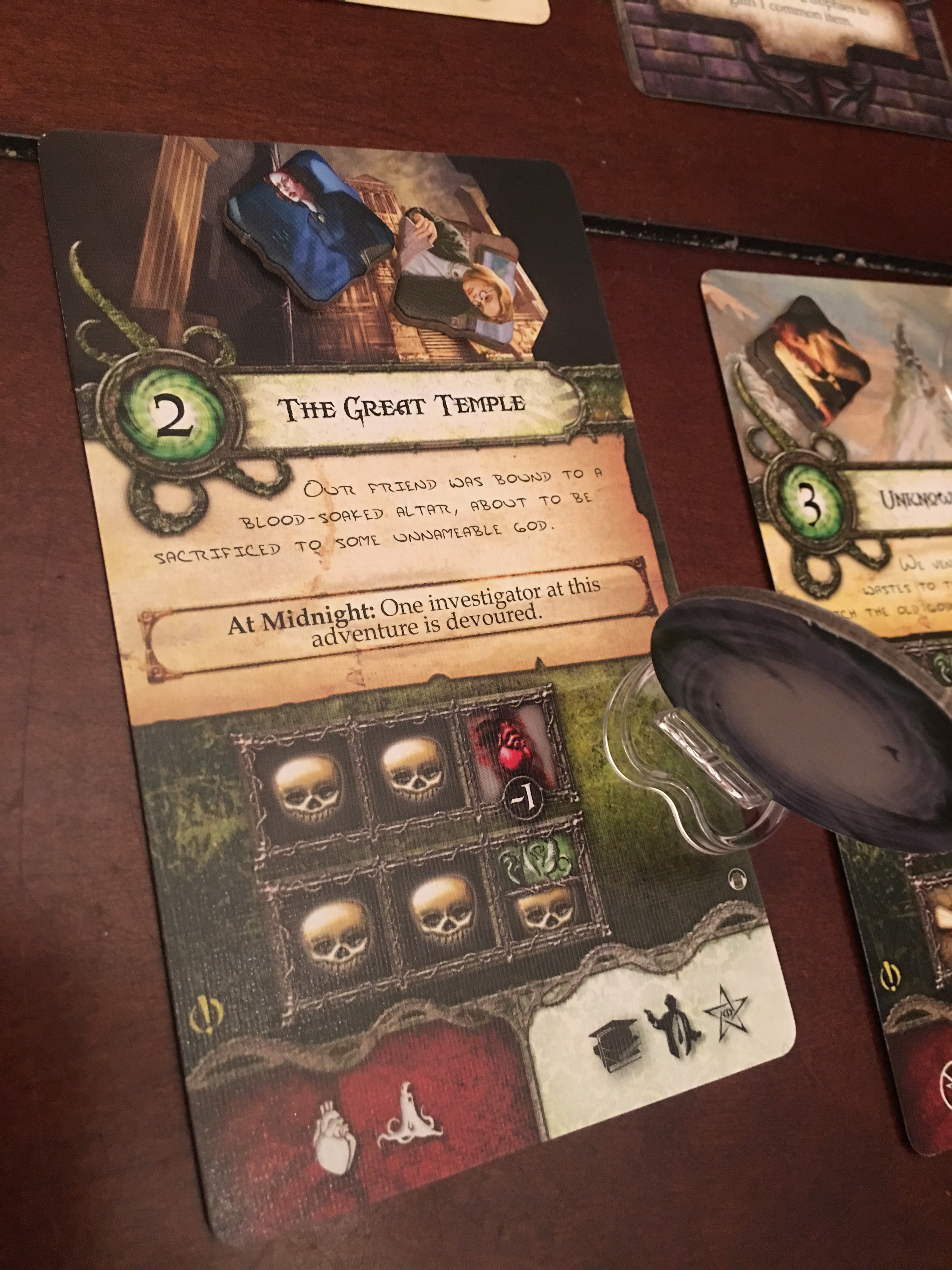 This game is very complicated. It practically needs a Game Master when being played, and it’s still easy to forget something. There is a clock counting time throughout the game with changing “at midnight” effects. There are different stipulations for different elder gods. Even though I’ve been playing this game for years, there are still times when things trip me up. This is a cooperative game so winning or losing is as a group. It’s still extremely difficult. I think someone said the win rate is about 40/60, and that Arkham Horror (a board game in the same universe) is 20/80. I’ve been told that hardcore fans don’t like these games to be easy.